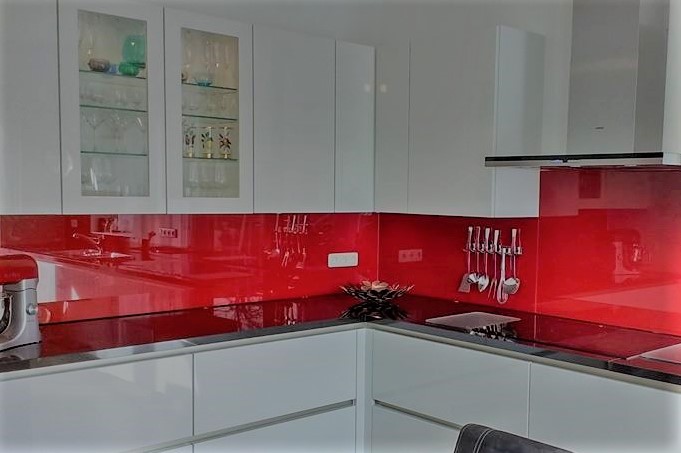 Keukenachterwand van gekleurd gelakt glas